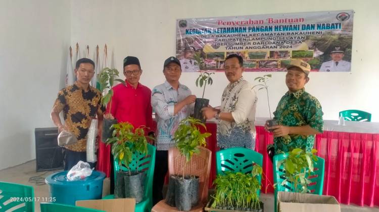 Cuplikcom - Bakauheni, Lampung Selatan - Pemerintah Desa Bakauheni Kecamatan Bakauheni Kabupaten Lampung Selatan menyerahkan bantuan bibit tanaman dan bibit ikan dari program ketahan pangan hewani dan nabati Desa Bakauheni Tahun Anggaran 2024, berupa bibit cabe, bawang, alpukat, medang, ember + lele ( budidaya ikan dalam ember ) kepada warga masyarakat desa Bakauheni