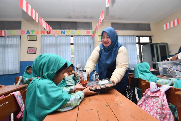 Ketua PWP Tingkat Wilayah PT Kilang Pertamina Internasional (KPI) RU VI Balongan, Erlita Triwibowo, secara langsung menyerahkan paket makan siang kepada para siswa, khususnya siswi-siswi yang tampak antusias menerima bantuan tersebut. Kehadiran Erlita menjadi momen spesial bagi para pelajar di sekolah tersebut. (foto:winan/cuplikcom)