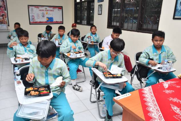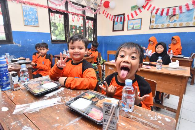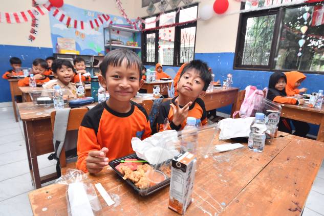 Siswa SDN Karanganyar Bumi Patra Indramayu tampak senang usai menerima paket makanan bergizi. (foto/winan/cuplikcom)