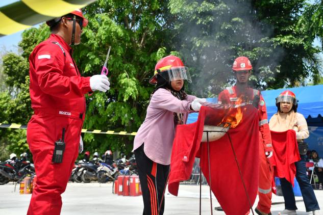 Salah satu peserta, seorang ibu rumah tangga, juga mempraktikkan cara memadamkan api menggunakan handuk basah. Aksi tersebut dilakukan di bawah pendampingan petugas HSE (Health, Safety, and Environment) dari Kilang Pertamina Balongan, yang memberikan bimbingan mengenai pentingnya keselamatan diri saat terjadi kebakaran. (foto:winan/cuplikcom)